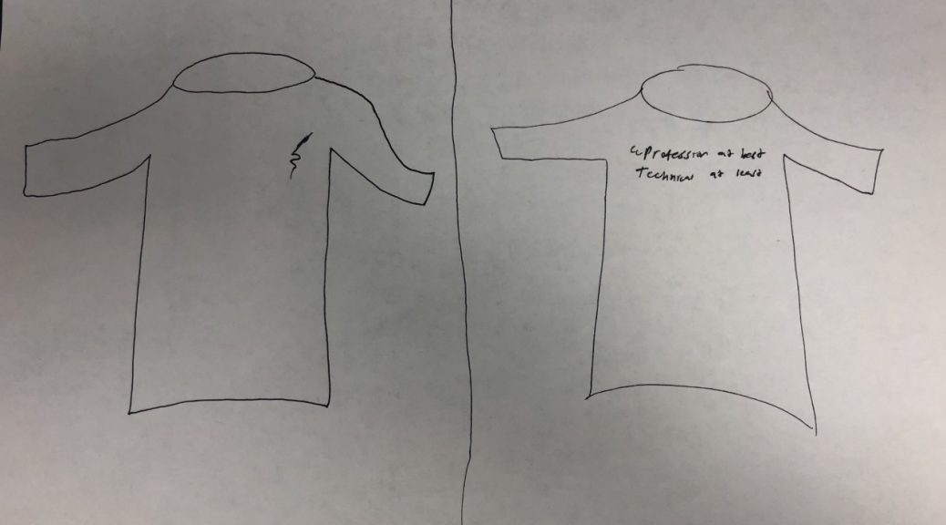 An impactful t-shirt is simple in design and has a clear catching message to it. Or on the other hand, has art can be interpreted in different ways that will provoke questions to people who view the shirt. I find that the text should be limit to very few words or one short sentence. No long paragraphs or complicated sentences. The shirt should be read within a simple glance at it. The text should go on the right side of the right on the upper pectoral muscle spot just below the neck, or along the upper back in bigger and bolder lettering. I find that a simple few words would go best for our shirt on the front while using an interpretable image on the back. Simple in design and can be understood within a glance or provoke a question. I think that simply either having PT Writing would suffice or something like “Professional at best, technical at least.” The color should be either black, grey, or navy blue with white lettering. The message is, however, you interpret it. I like it because it’s a ubiquitous phrase that can be used in a lot of contexts.